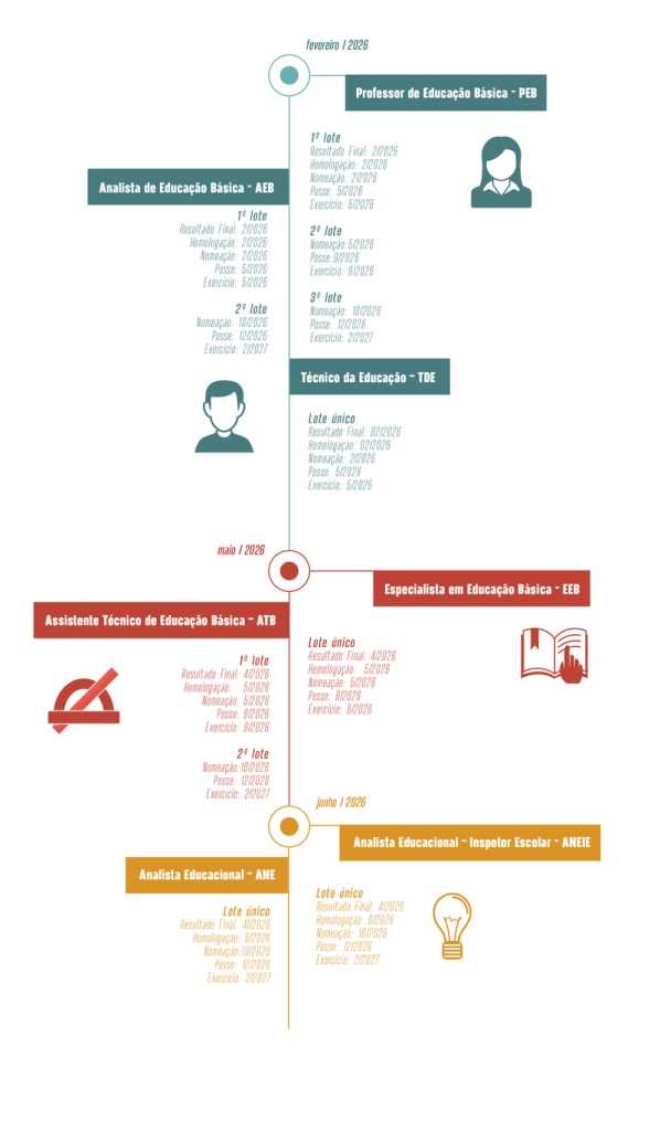 Para os cargos de Especialista em Educação Básica (EEB) e Assistente Técnico de Educação Básica (ATB), a previsão é de publicação do resultado final em abril, com homologação prevista para maio. As nomeações dessas carreiras estão previstas para ocorrer a partir de maio.